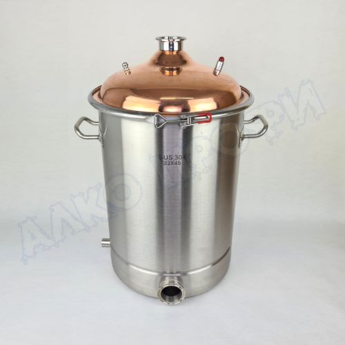 Перегонный куб из пищевой нержавеющей стали AISI 304 кастрюльного типа с крышкой из меди отечественного производства. Используется с дистилляторами (самогонными аппаратами) в качестве емкости нагрева спиртосодержащих жидкостей.