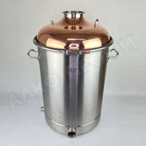 Перегонный куб из пищевой нержавеющей стали AISI 304 кастрюльного типа с крышкой из меди отечественного производства. Используется с дистилляторами (самогонными аппаратами) в качестве емкости нагрева спиртосодержащих жидкостей.